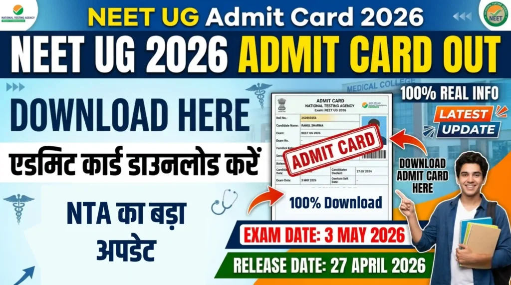 NEET UG 2026 की तैयारी कर रहे लाखों छात्रों का इंतज़ार अब खत्म होने वाला है। National Testing Agency (NTA) ने NEET UG 2026 के एडमिट कार्ड जारी करने को लेकर एक बड़ा अपडेट दिया है। जैसा कि आप जानते हैं, परीक्षा 3 मई 2026 को आयोजित होने वाली है, ऐसे में एडमिट कार्ड परीक्षा केंद्र में प्रवेश के लिए सबसे महत्वपूर्ण दस्तावेज है। आप सभी को बता दे कि NTA द्वारा नीट यूजी 2026 के लिए एडमिट कार्ड 26 अप्रैल को जारी हो गए है ।आप नीचे दिए हुए लिंक के माध्यम से ऑफिशियल वेबसाइट पर जाकर डाउनलोड कर सकते है ।