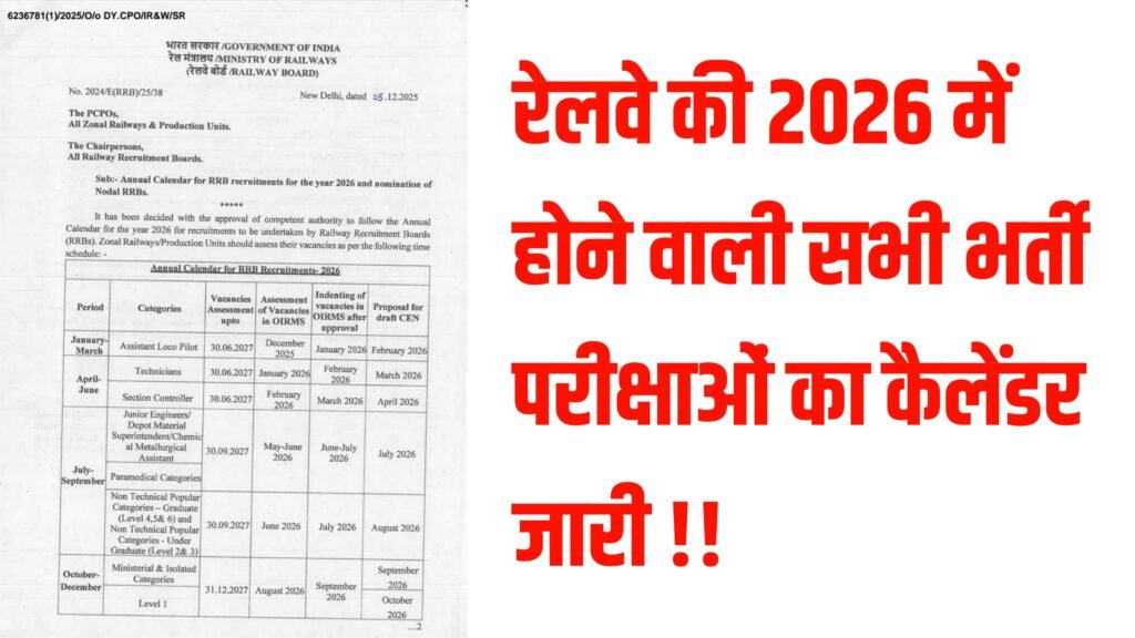 रेलवे भर्ती बोर्ड ने आज 18 दिसंबर 2025 को रेलवे में आने वाली सभी भर्ती परीक्षाओं के लिए एक वार्षिक कैलेंडर जारी कर दिया है। इसकी मदद से आप अपनी तैयारी को जारी रख सकते हो और आपको बता दें कि रेलवे का पूरा प्रयास रहता है कि वह भर्तियों को समय से पूरा कराये।