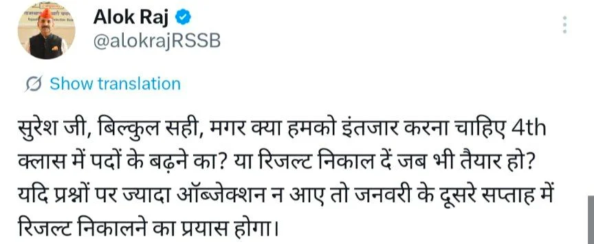 वहीं परिणाम दिसंबर महीने में जारी होने की संभावना है। इस बार बोर्ड द्वारा फाइनल आंसर की और रिजल्ट दोनों एक साथ घोषित किए जाएंगे। अनुमान है कि राजस्थान फोर्थ ग्रेड का रिजल्ट, पटवारी और वीडीओ परीक्षा परिणाम जारी होने के बाद घोषित किया जाएगा।